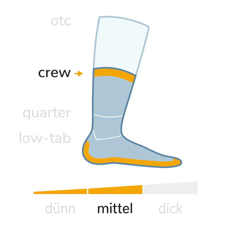Die MERINO STRIDE crew besitzt wie die STRIDE (ohne Wolle) keine Polsterung und reicht bis unter die Wade. Eine klasse Lösung, wie auch bei der dünneren Sockenvariante COOLMESH II Merino.